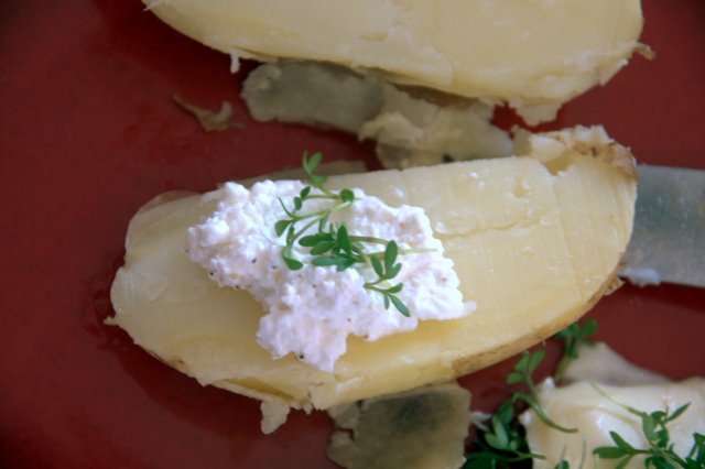 Ziemniaki dobrze oczyścić i ugotować w mundurkach. Ser rozdrobnić, dodać śmietany i wymieszać z pokrojoną w kosteczkę cebulą. Doprawić. Ziemniaki wyjąć do miseczki, obficie posypać szczypiorkiem. Na talerz nakładać: ziemniaka, ser i kawałek masła.