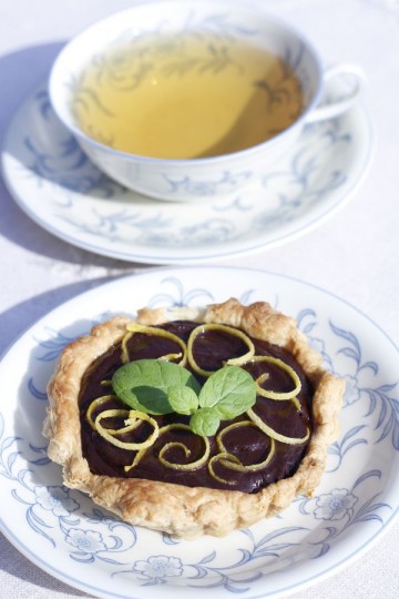 Czekoladę drobno posiekać. Śmietankę przelać do rondelka, zagrzać razem z gałązkami mięty na małym ogniu przez ok 10 minut. Wyciągnąć liście mięty, dodać skórkę cytrynową i zalać czekoladę śmietaną. Mieszać aż do rozpuszczenia czekolady. Gdy czekolada przestygnie i nieco zgęstnieje, wylać ją do tartaletek.