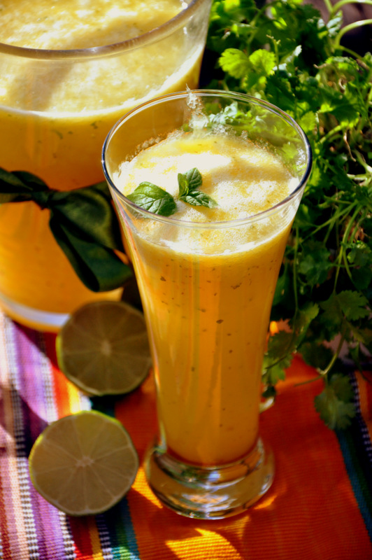 Ananasa obrać, pokroić w kostkę, wrzucić do blendera, dodać cukier, wyciśnięty sok z limonki i zmiksować na gładką masę. Liście mięty i kolendry posiekać. Masę ananasową przełożyć do dwóch dzbanków. Do jednego dodać mięty, do drugiego kolendry, uzupełnić wodą. Wymieszać i schłodzić.