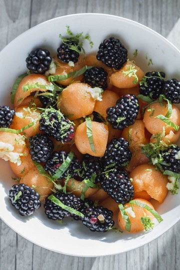 Sałatka z melona i jeżyn, podana schłodzona, to świetne ukojenie w upalny dzień.