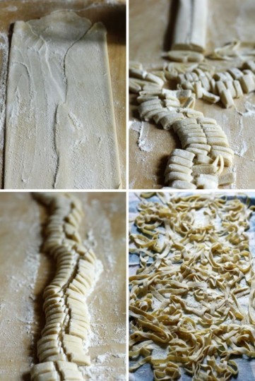 Ciasto bardzo cienko rozwałkuj. Czynność ta trwa dosyć długo i wymaga nieco siły :) Kiedy jest tak cienkie, ze widać przez nie palce, znaczy że jest już gotowe. Oba brzegi ciasta zwiń do środka, później znowu do środka… i powtarzaj tę czynność do momentu, gdy obie połówki ciasta dojdą do środka. Ostrym nożem pokrój zrulowane ciasto w paski o dowolnej grubości (od 5mm do 1cm). Posyp mąką i zostaw do przeschnięcia.