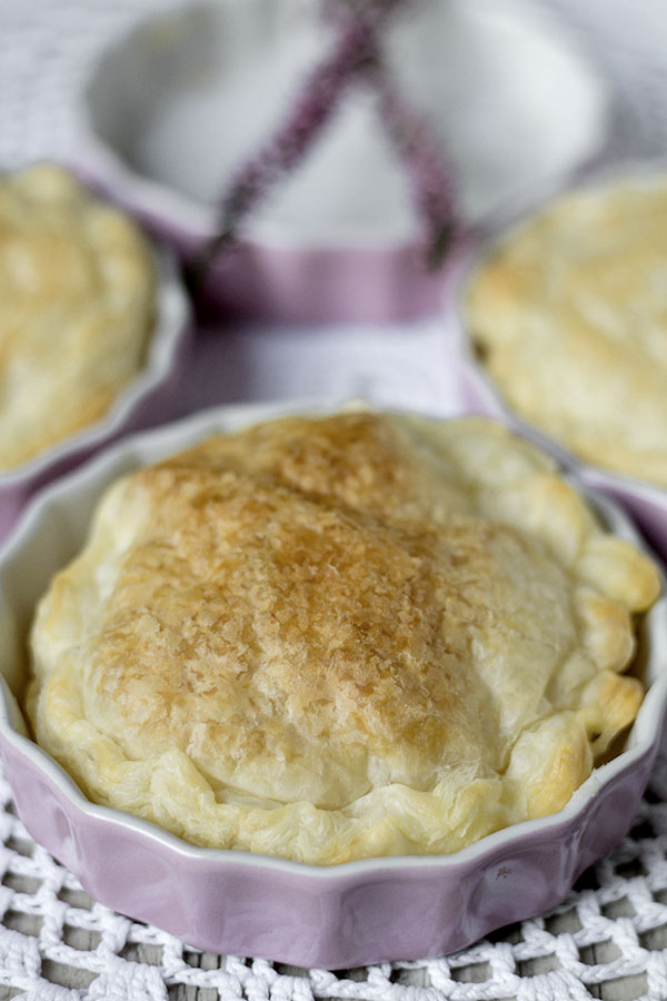 Z ciasta francuskiego wytnij krążki o średnicy ok .2 cm większej niż foremki do zapiekania. Ciastem przykryj jabłka, boki ciasta wepchnij lekko do środka.