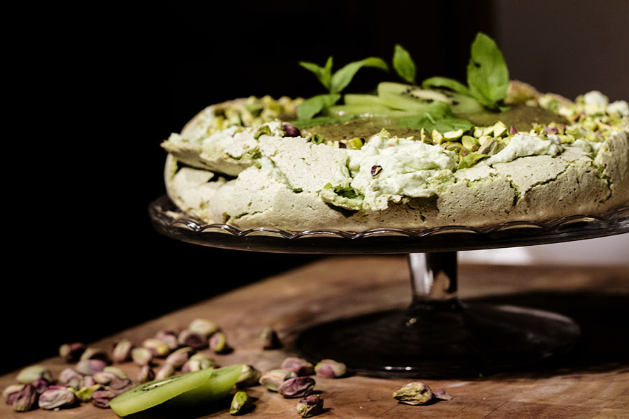 Zielona pavlova powstała z potrzeby chwili. Systematycznie organizujemy ze znajomymi gotowanie monochromatyczne, czyli gotowania (i nie tylko) w ustalonym kolorze. Jedynym stałym elementem, poza składem osobowym, jest zawsze pavlova w odpowiednim kolorze. To już taka tradycja, za której kultywowanie odpowiedzialna jestem ja :)