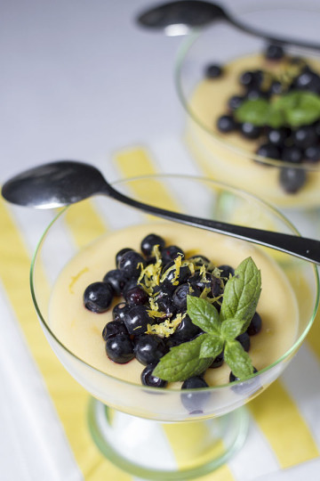 Wystarczy na wierzch dać jagody, starą skórkę z cytryny i miętę. Jeśli nie jesteście amatorami kwaśnych smaków, jagody posypcie dodatkowo cukrem pudrem.