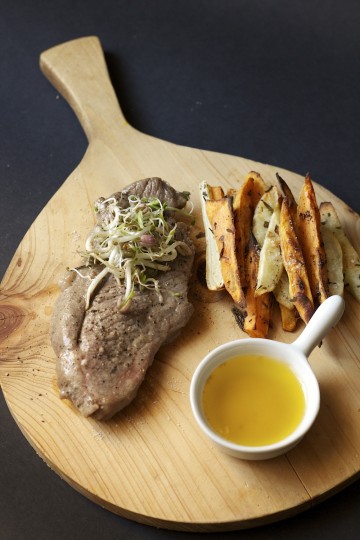 Steki z udźca jagnięcego konfitowane w maśle (bardzo wolna obróbka cieplna, dzięki czemu mięso nie traci swoich właściwości), rozmarynie i czosnku są delikatne, miękkie, rozpływające się z w ustach.