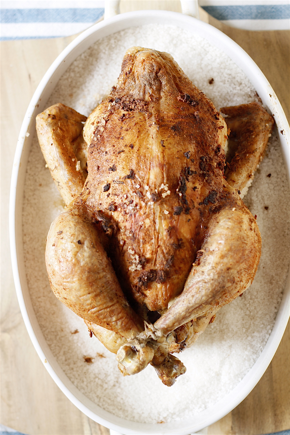 Rzadko jem kurczaka, ale czasem nie potrafię się oprzeć pokusie. Zdecydowanie najlepszy kurczak to kurczak pieczony w całości. Tym razem też tak go upiekłam, ale nieco inaczej – na soli. Sól zatrzymuje wodę, dzięki czemu kurczak jest wilgotny i soczysty, a skórkę ma chrupiącą. I wcale nie jest słony, pomimo, że leży na kilogramie soli. Bez obaw – kurczak jest naprawdę pyszny.